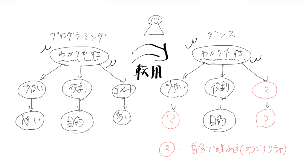 転用するというのは、「違う世界からその構造を借りて自分に応用すること」です。この考え方を”アナロジー”と言います。私がアナロジーを活かしている例をご紹介しましょう。ダンスでショーやルーティンを作るときに私が一番こだわるのは「わかりやすさ」です。どれだけユニークな動きや複雑なリズムメークを入れても、見ている側に伝わるという着地ができなくては意味がないと思っています。私が「わかりやすさ」という点で拝借しているのが、プログラミングの考え方です。プログラミングの世界にはシンプルなコードほど安定するという鉄則があります。雑多に詰め込んだコードはバグが出やすいし、読む人やコンピュータにも伝わらない。
